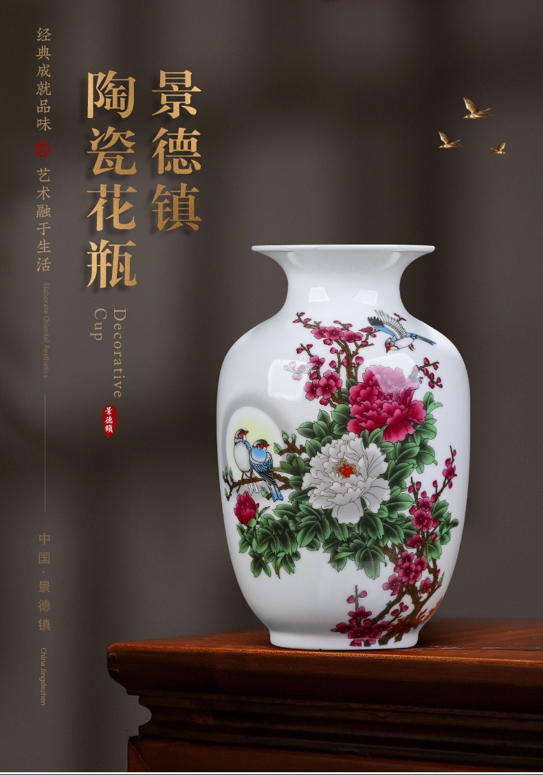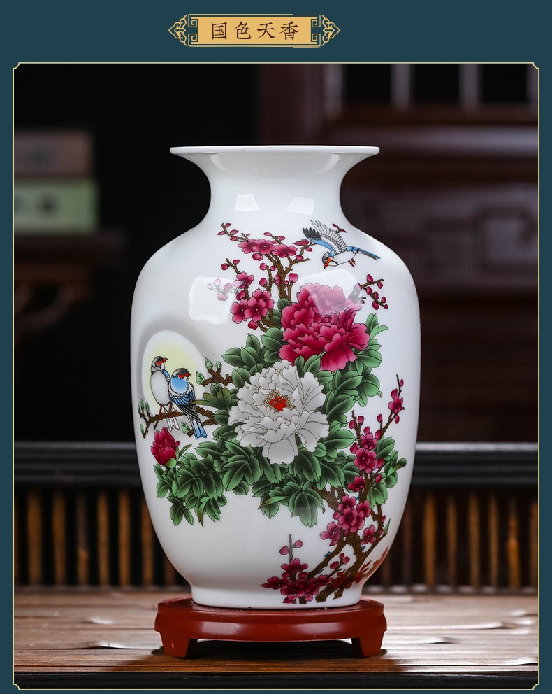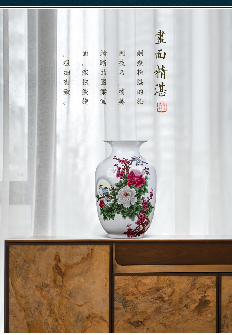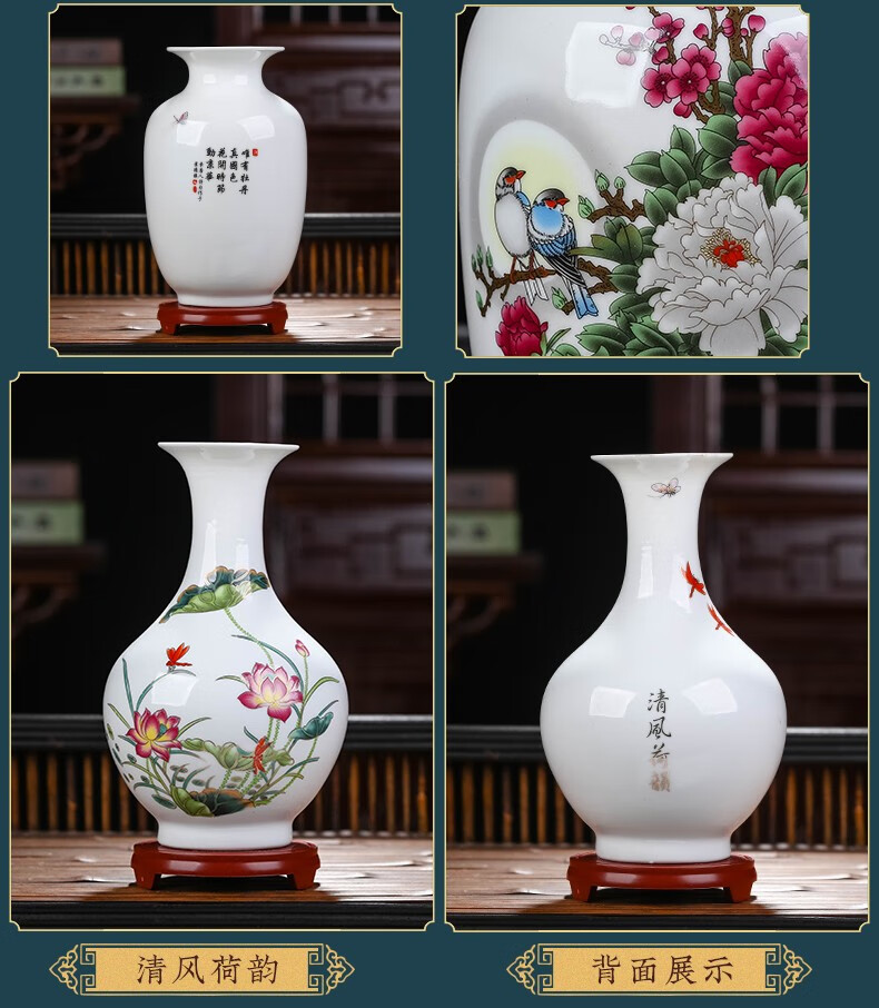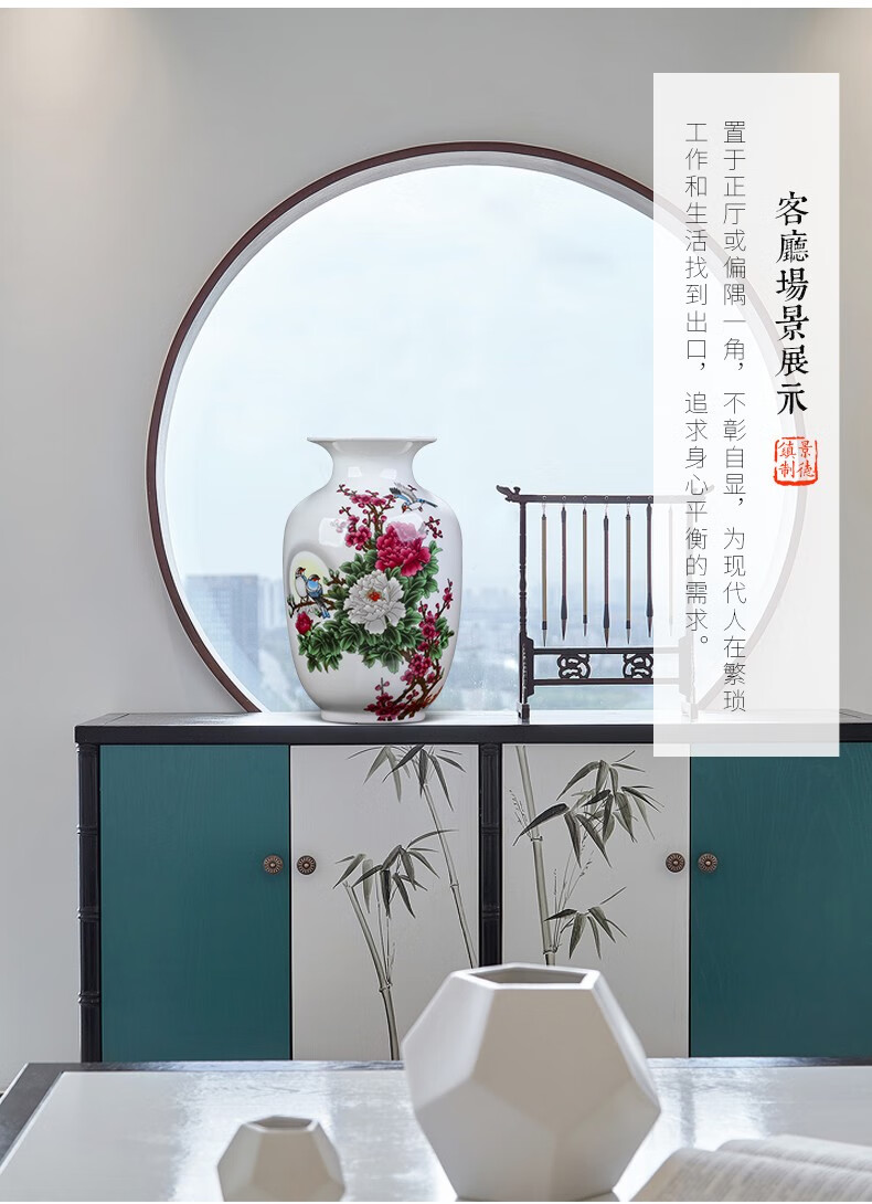 景德镇陶瓷插花工艺品家居装饰摆件中式现代家居客厅装饰书房电视柜水培插花瓶月亮赏瓶高22+底座